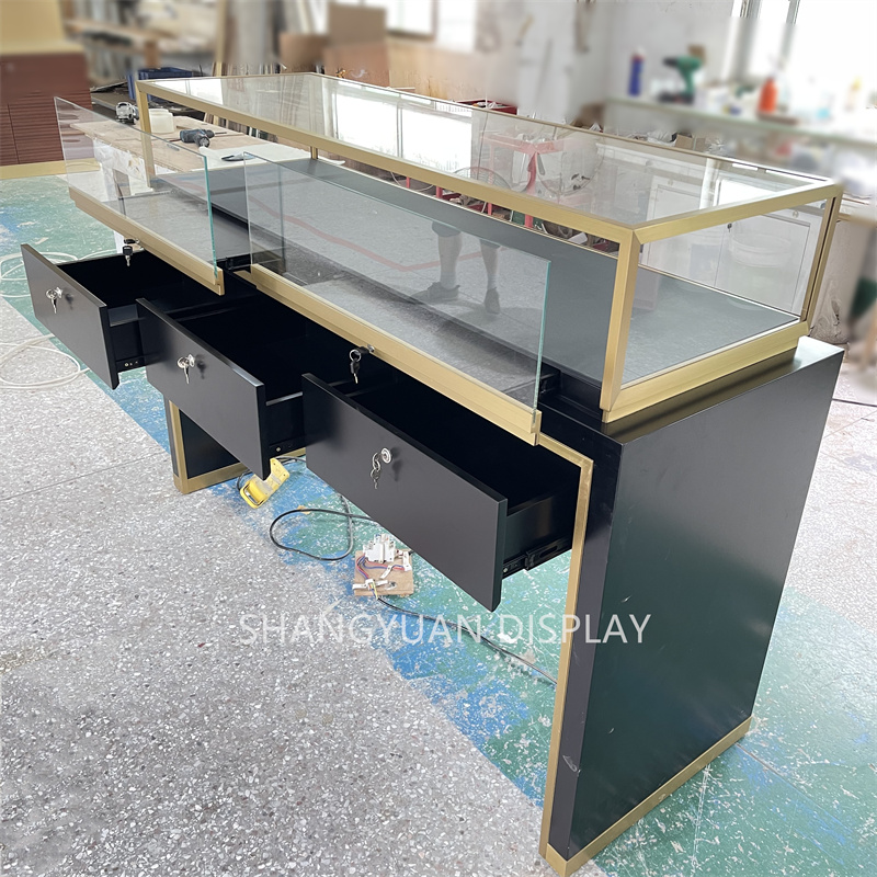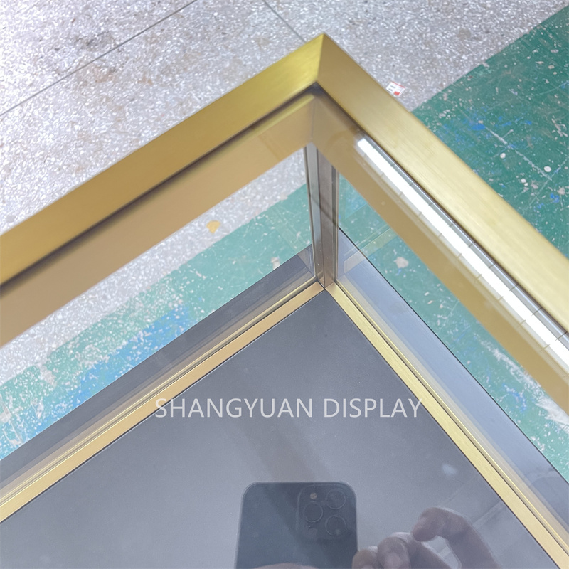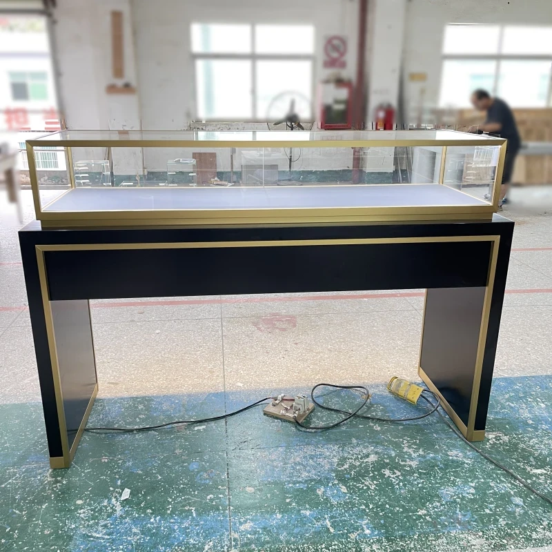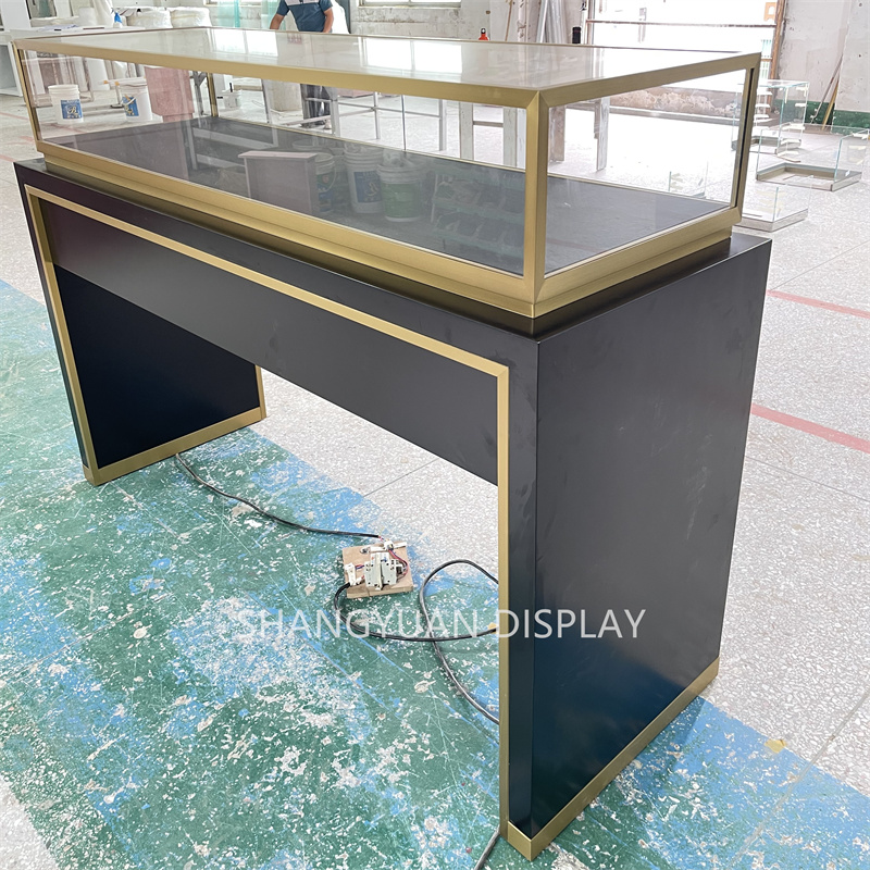 This Custom Display Cases features a sleek and sophisticated design. The base is coated with a glossy black paint, which not only gives it an elegant appearance but also ensures durability. The metal elements, highlighted in gold, add a touch of luxury and a modern aesthetic. Its classic color – matching and refined craftsmanship make it a timeless piece that can withstand the test of time in terms of both style and quality.